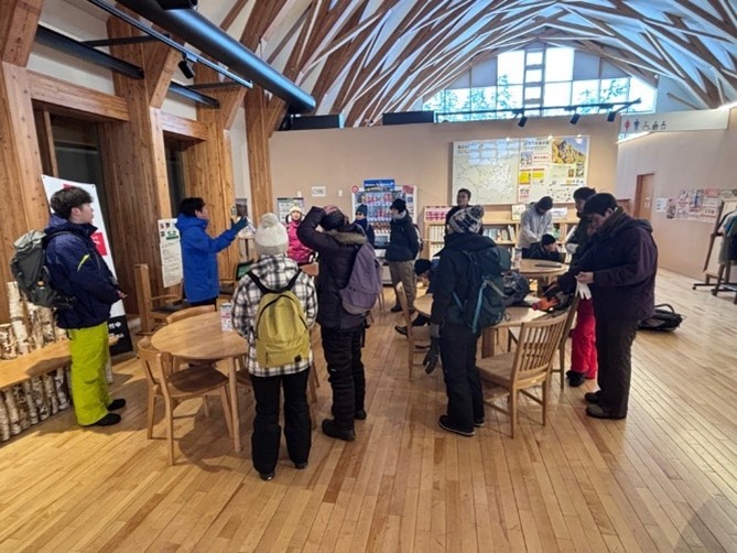 旭岳ビジターセンターで、ガイドからツアースケジュールや安全に楽しむための注意事項を確認 。この日は姿見駅付近で風速14mの強風が吹いていたため、安全を考慮して尻滑りの会場を山麓コースへ変更する「冒険らしい」幕開けとなりました 。