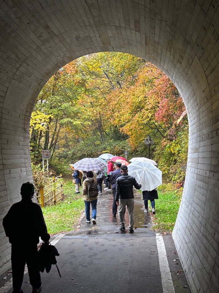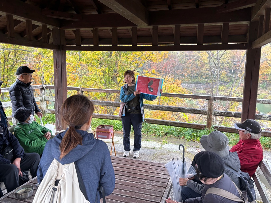 当日はあいにくの雨模様でしたが、神居古潭峡谷の美しい紅葉を楽しみながら講座を実施することができました。参加者の全員が神居古潭を訪れた経験がありましたが、神居古潭の変成岩やアイヌの魔神伝説を初めて知った方も多く、新しい学びの機会となりました。
