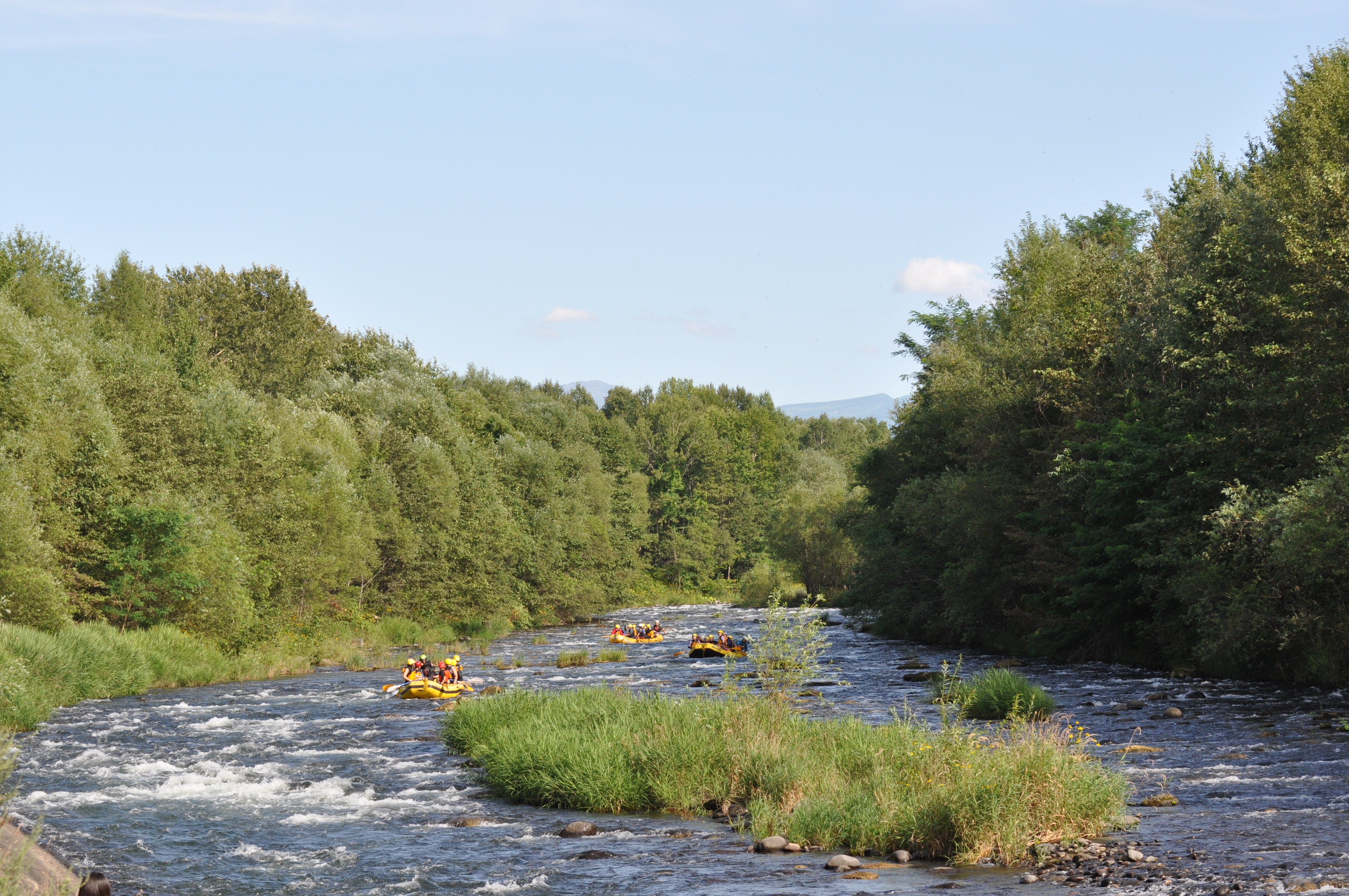 構想地域や周辺の地形について紹介後,上川町でラフティングツアーを運営しているアルパインリバーガイドさんの案内のもと,川下りを行いました。今回はひがしかぐら森林公園キャンプ場あたりからスタートし、忠別川を下り、東川親水河川公園パークゴルフ場で上がりました。