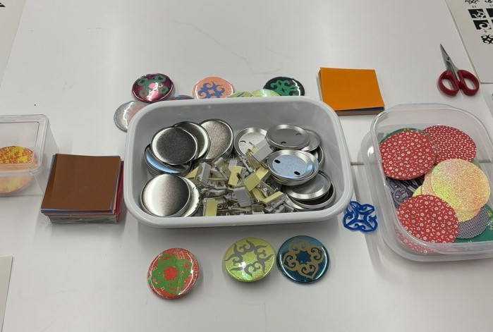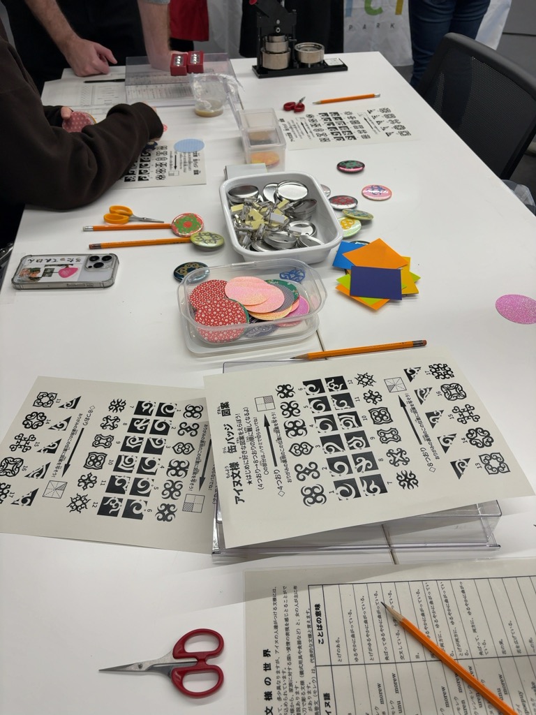 切り紙でできるアイヌ文様といろいろな折り紙を組み合わせて、みなさん素敵な缶バッジを作っていました。