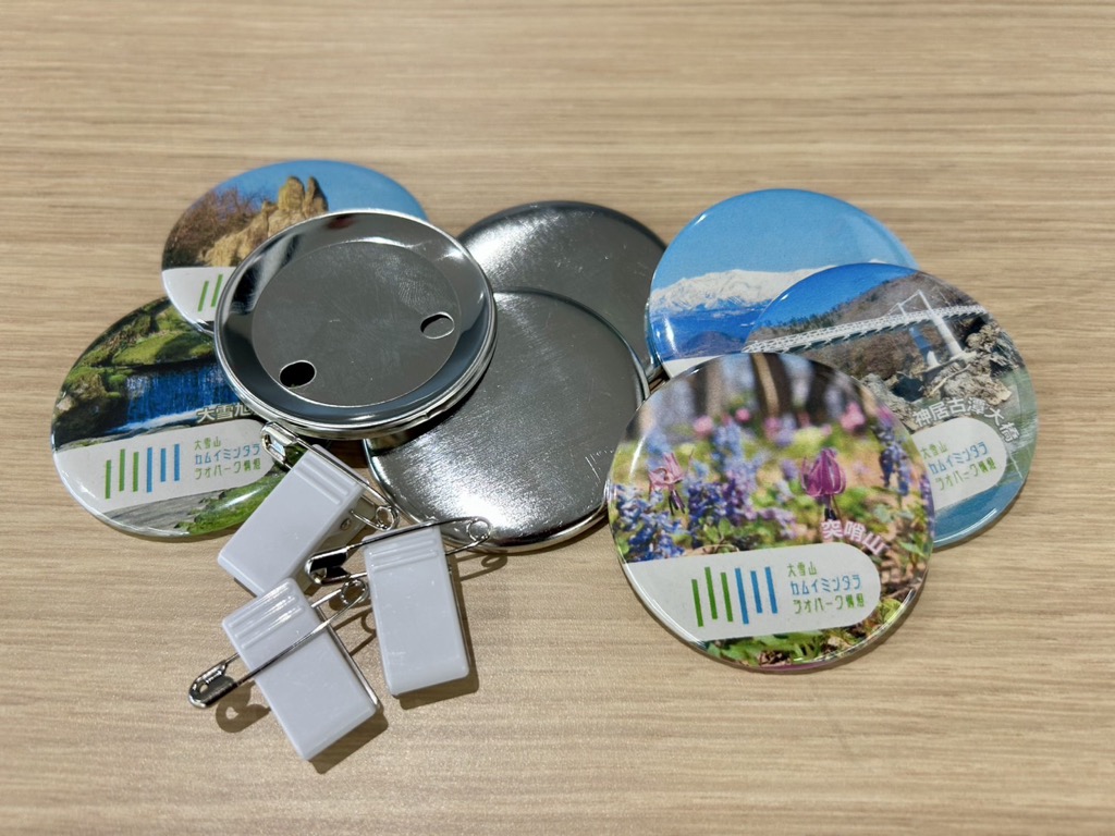本構想地域1市7町の見どころ写真を使ったオリジナル缶バッジ全8種類(くじでの販売のため、何が当たるかは引いてからのお楽しみ)